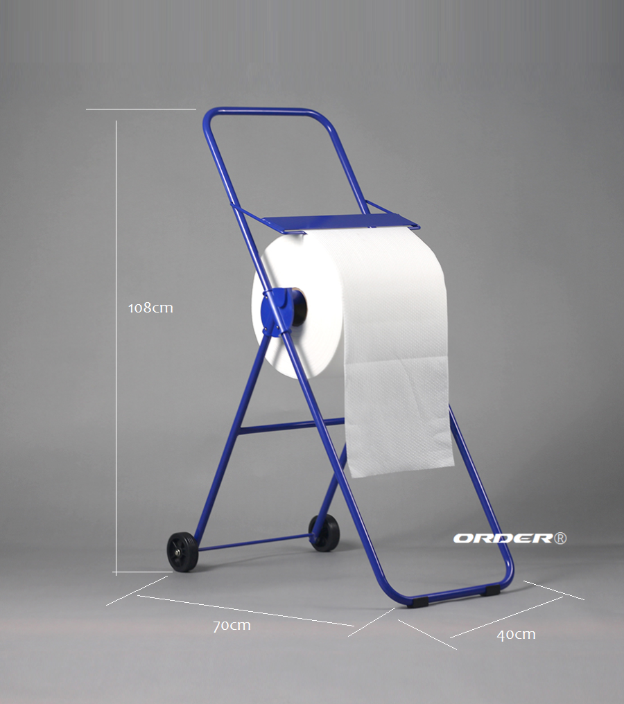 A mobile, free-standing blue roll dispenser that can be moved around the workplace