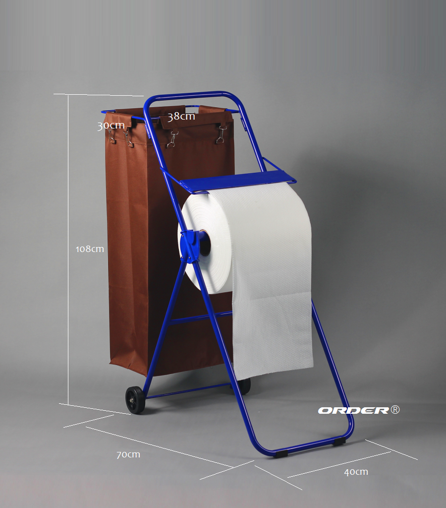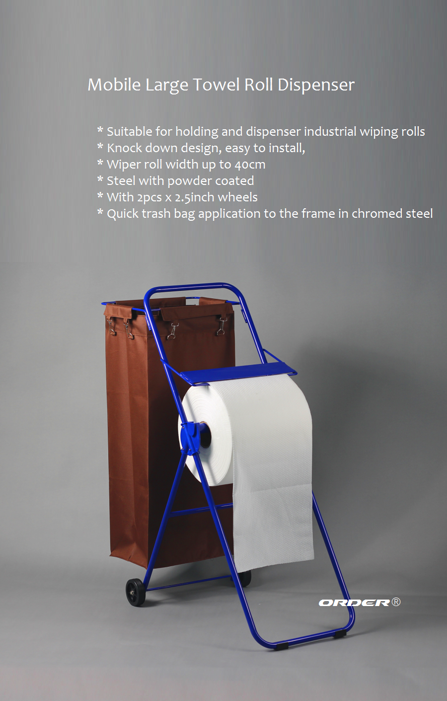 A large, sturdy, blue tubular steel dispenser that can be moved around as a free-standing unit.