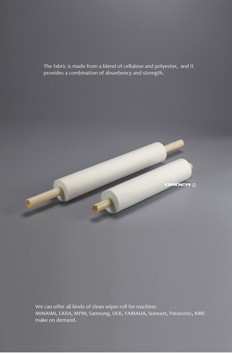 Feature: 1,High absorbent and exceptional low lint levels. 2, Remove the excess solder paste, adhesive and solvents that can ruin any PCBs. 3,High strength 4,Roll can be customized to suit your exact requirement. |