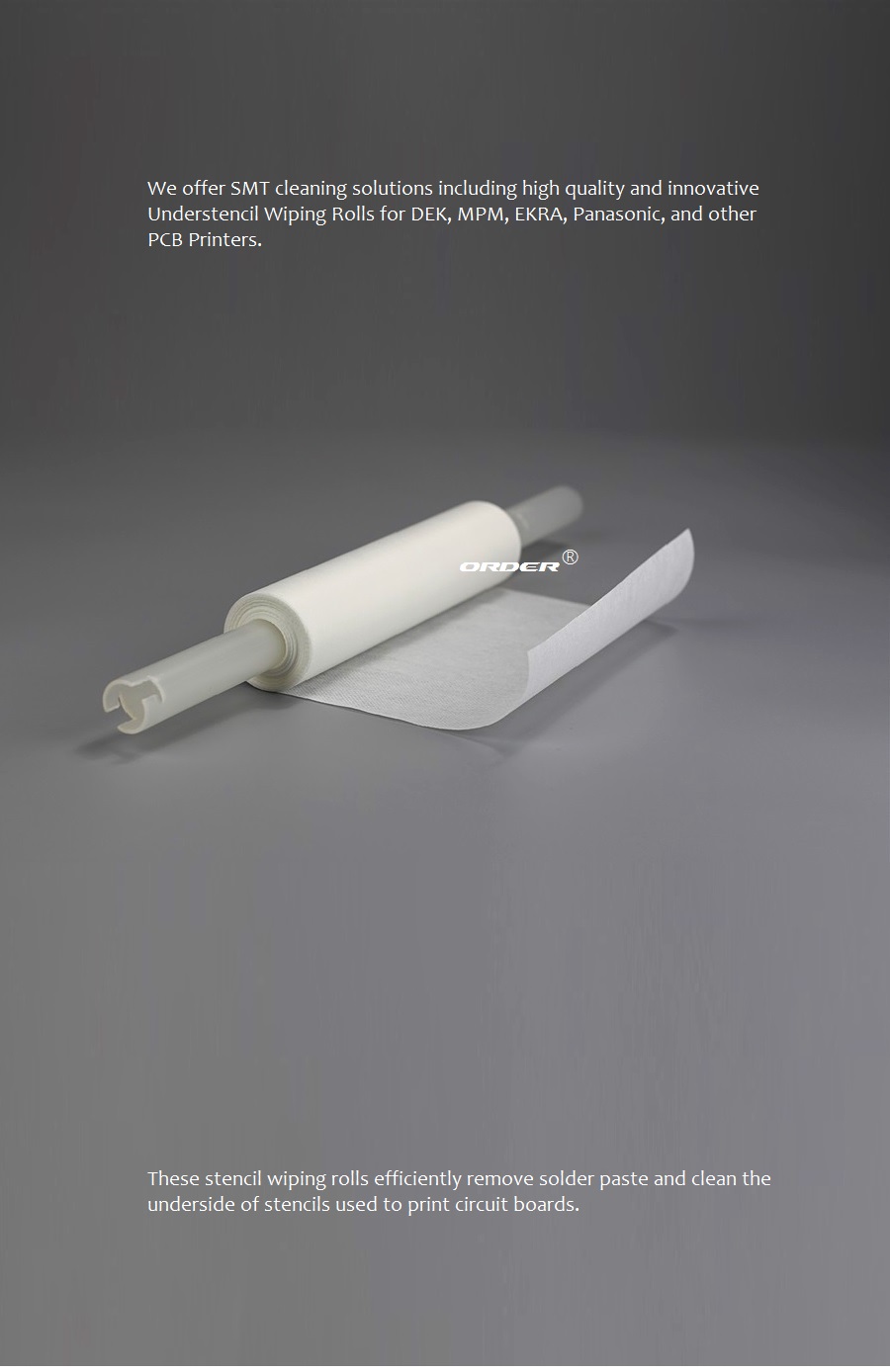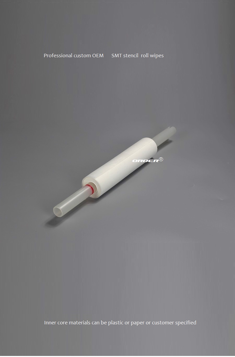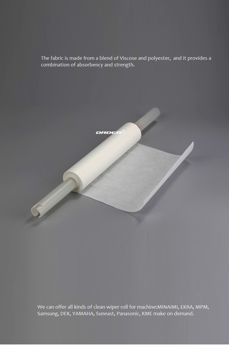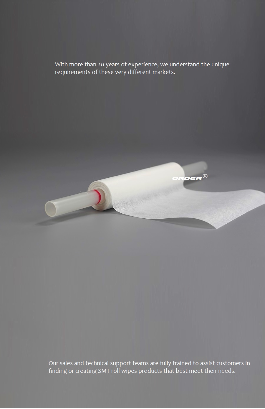 Feature: 1,High absorbent and exceptional low lint levels. 2, Remove the excess solder paste, adhesive and solvents that can ruin any PCBs. 3,High strength 4,Roll can be customized to suit your exact requirement. |