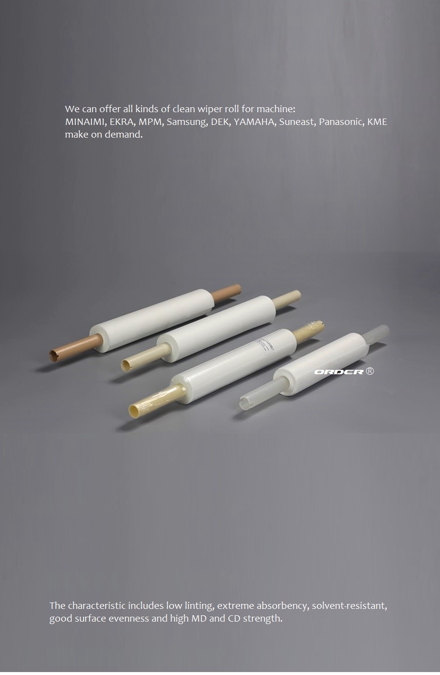 Feature: 1,High absorbent and exceptional low lint levels. 2, Remove the excess solder paste, adhesive and solvents that can ruin any PCBs. 3,High strength 4,Roll can be customized to suit your exact requirement. |